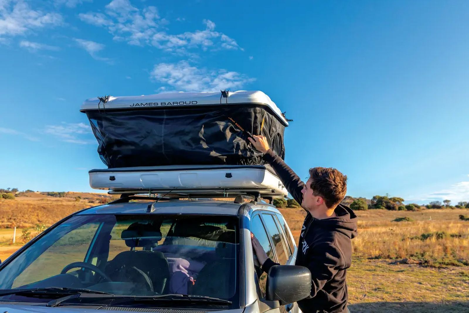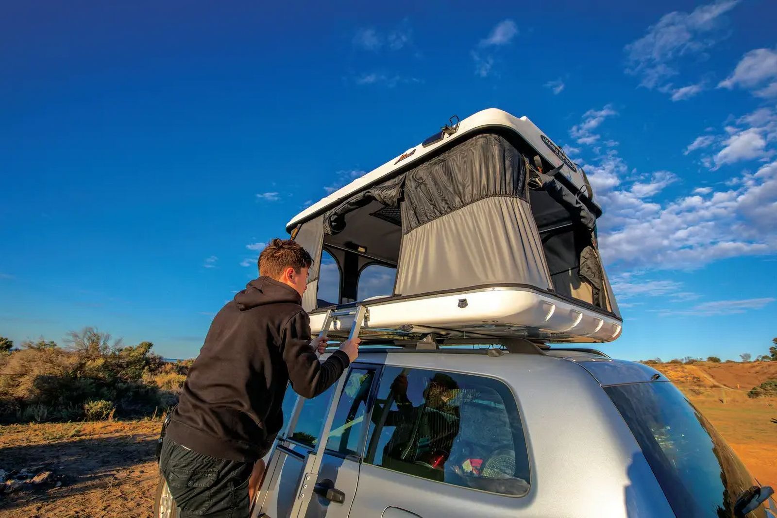 The James Baroud Evasion is a premium hardshell rooftop tent designed for adventurers who demand quick setup, superior comfort, and unwavering durability. Handcrafted with fiberglass-reinforced materials and engineered to perform in any climate—from desert heat to seaside storms—this rooftop tent delivers the ultimate balance of luxury and practicality. With its gas-strut assisted opening, weatherproof canvas, and cutting-edge ventilation system, the Evasion ensures every journey is both comfortable and secure.
